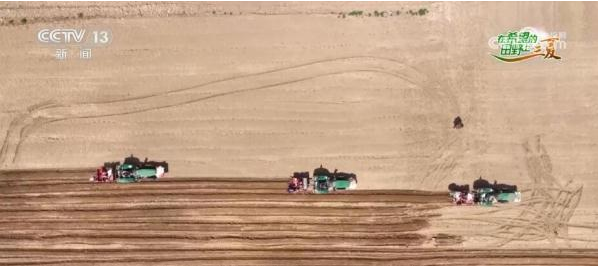 总台记者 崔肖冉:这里是山西盂县东梁乡。在我身后,今年全县最后200亩的加工型马铃薯播种正在进行。大家可以看到,一台台播种机穿梭在田间地头,一派繁忙的景象。