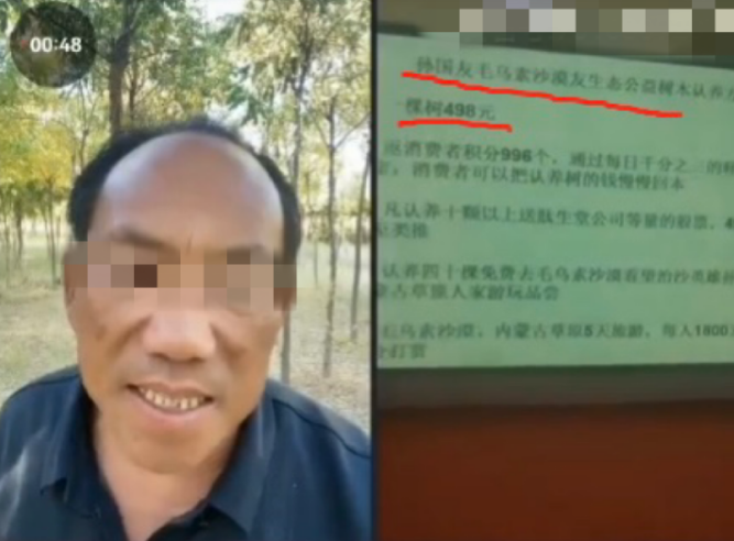 根据汪律师提供的视频,孙国友疑似通过直播连线的方式,向他人集资认养树木。连线视频里,一则“孙国友毛乌索沙漠友生态树木认养方案”中写道:“一棵树498元,返消费者积分996个,通过每日千分之三释放转换成云宝,消费者可以把认养树的钱返本金;凡认领10棵树以上送某公司等量股票,10棵树为4980股;认养40棵以上除获得等量股票外,免费去宁夏灵武市看望治沙英雄孙国友……”