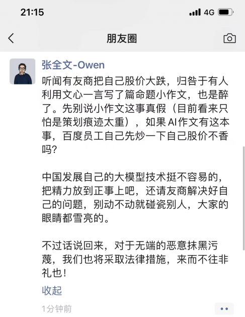 科大讯飞的这一言论无疑惹怒了文心一言市场负责人张全文,于是就有了上述朋友圈怒怼一文。