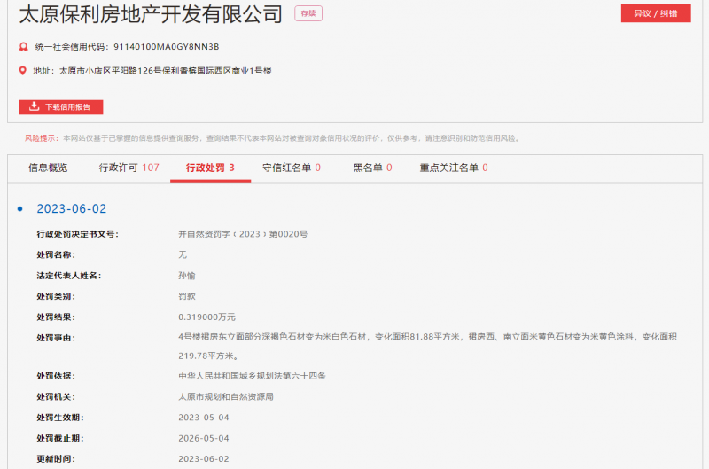 行政处罚详情显示,太原保利房地产开发有限公司建设项目4号楼裙房东立面部分深褐色石材变为米白色石材,变化面积81.88平方米,裙房西、南立面米黄色石材变为米黄色涂料,变化面积219.78平方米。