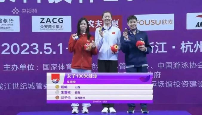 ▲2023年全国游泳冠军赛女子100米蛙泳,杨畅(中)获得冠军