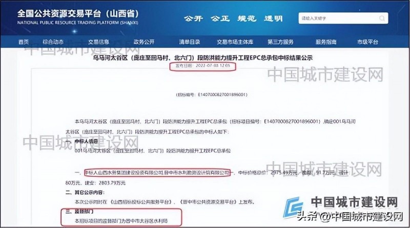 2022年7月8日,晋中市太谷区水利局发布中标公告,中标人为山西水务集团建设投资有限公司、晋中市水利勘测设计院有限公司,中标价格总价为2975.49万元,其中,勘察91.7万元,设计80万元,建安2803.79万元,监督部门亦为晋中市太谷区水利局。