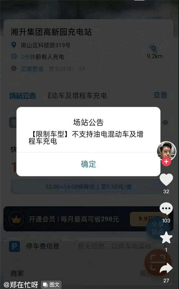 有博主上传照片显示,深圳一充电站限制插混车辆进场充电,该充电站的APP直接发布通告称:不支持油电混动车和增程车充电。