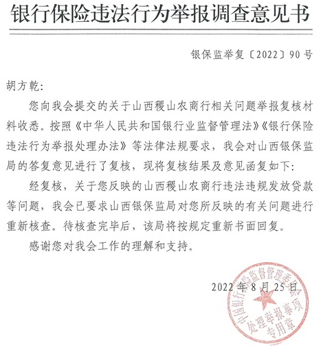 胡先生虽然多次向运城市农村信用联社、山西省农村信用联社、山西运城银保监分局(以下简称运城银保监分局)、山西银保监局、中国银保监会(以下简称银保监会)等单位实名举报。银保监会也查实了这笔290万贷款,回流到运城市中星汽车销售有限公司的账户,法人徐智星是实际用款人,应该由徐智星偿还该笔贷款。虽然中国银保监会也对稷山农商银行的贷款“三查”不到位的行为予以责令改正、罚款30万元、警告等处罚。令胡先生不解的是,既然中国银保监会责令稷山农商银行对贷款“三查”不到位进行改正,为什么稷山农商银行对胡先生被套路欺骗作担保的事情迄今为止却只字未提呢?是稷山农商银行对中国银保监会有令不行、阳奉阴违呢?还是在抗令不尊、我行我素?