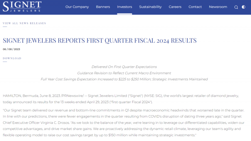 作为一家主要在北美运营的公司,订婚戒指几乎占到徽记珠宝接近一半的销售额。公司CFO Joan Hilson表示,更新后的财年指引反映出下降势头正在二季度延续,包括弱于预期的母亲节活动,宏观经济压力限制消费者选择更高价商品的能力,以及竞争性打折。