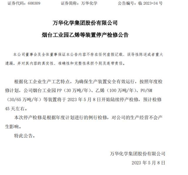 万华化学:烟台工业园PP(30万吨/年)、乙烯(100万吨/年)、PO/SM(30/65万吨/年)等装置于5月8日开始陆续停产检修,预计检修45天左右。