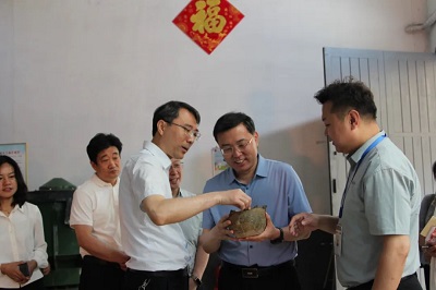 武市长细致参观了工厂每一道非遗手工工序,逐一询问了解工艺细节和匠人的工艺职称。对设计精巧、工艺精湛的《头炉壶》大加赞赏,强调要做好知识产权保护意识,并赞叹中国文化的智慧在手工艺铁壶制做中运用的巧妙和精深。