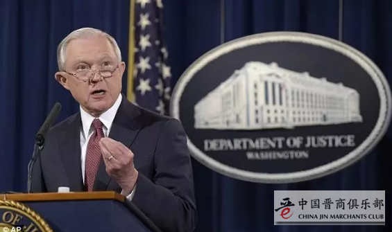 ▲塞申斯在美国司法部的新闻发布会上(图片来源:AP)