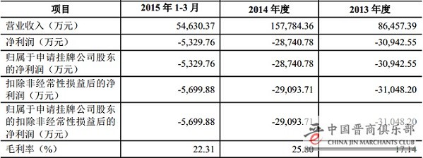如上表可以看到从2013到2014年度酒仙网营业收入从8.65亿上升到15.78亿,其净利润为负。2015年第一季度的净利润也是为负。根据该公司公开转让说明书的披露,造成公司最近两年营业收入增长82.5%还亏损的原因:销售费用、管理费、快速增加,导致公司报告期内一直未能盈利。