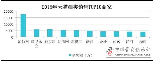 上图显示,2015年天猫酒类销售TOP10商家分别是(按销售额):酒仙网官方旗舰店、腾易永立酒类专营店、也买酒官方旗舰店、购酒网官方旗舰店、莉得丰酒类专营店、醉梦酒类专营店、金沙酒类旗舰店、壹玖壹玖官方旗舰店(1919),洋河官方旗舰店和泽雨食品专营店。