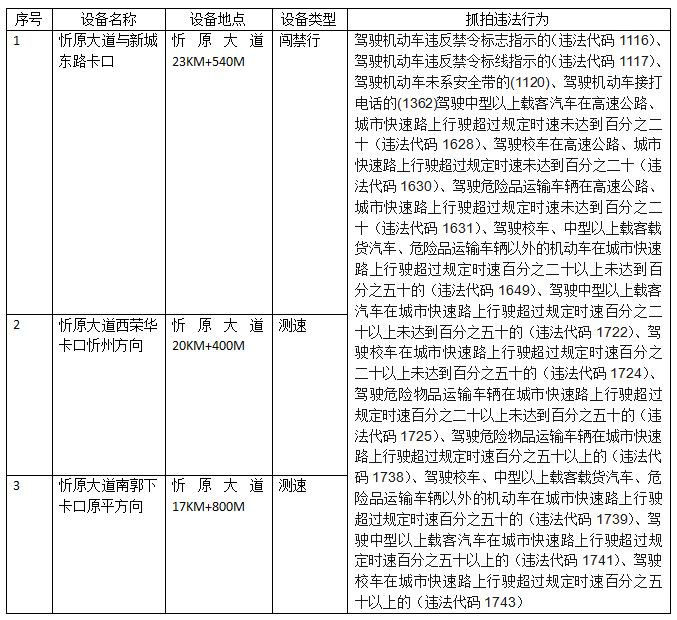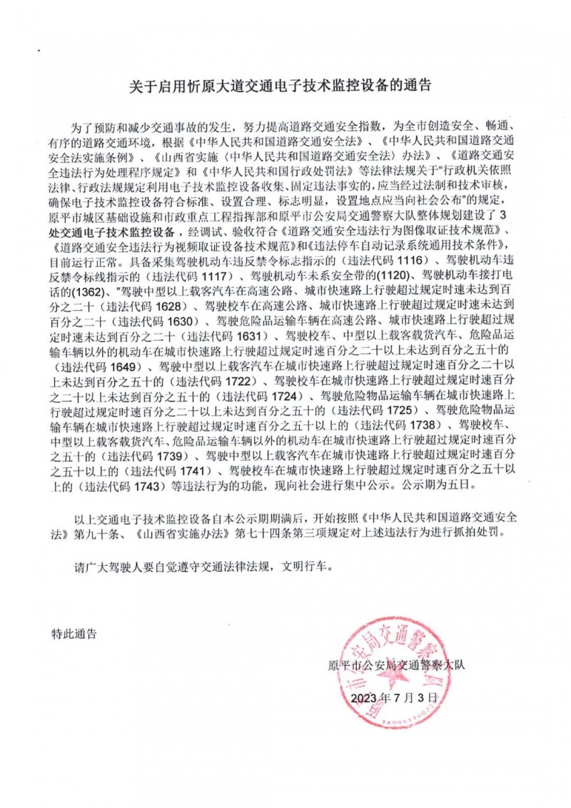 以上交通电子技术监控设备自本公示期期满后,开始按照《中华人民共和国道路交通安全法》第九十条、《山西省实施办法》第七十四条第三项规定对上述违法行为进行抓拍处罚。