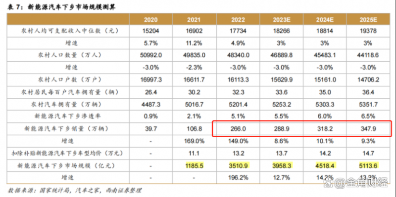 以被寄予厚望的“新能源车下乡”为例,西南证券在基于“农村人均可支配收入每年同比增长3%”等乐观假设基础上,预测2023-2025年新能源车下乡存量分别为288.9万辆、318.2万辆、347.9万辆。