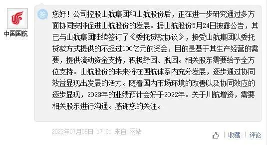 对于上述收购,中国国航于7月5日在投资者互动平台回应称,公司控股山航集团和山航股份后,正在进一步研究通过多方面协同安排促进山航股份的发展。