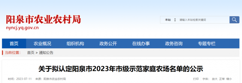根据阳泉市农业农村局《关于开展2023年市级示范家庭农场创建和申报工作的通知》(阳农局字〔2023〕31号)要求,经家庭农场自愿申报、乡镇筛选推荐、县级审核推荐、市级组织专家评审,阳泉市农业农村局拟对“盂县喜丰收家庭农场”等5个家庭农场授予“阳泉市市级示范家庭农场”称号,现予以公示。公示期从2023年7月11日至2023年7月17日。如有异议,请向阳泉市农业农村局农村政策与合作经济指导科反映。