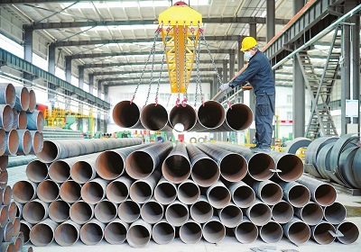 山西万流金属制品有限公司工人正在赶制订单加工螺旋钢管