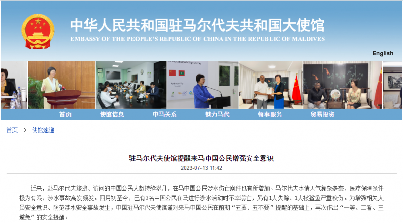 近来,赴马尔代夫旅游、访问的中国公民人数持续攀升,在马中国公民涉水伤亡案件也有所增加。马尔代夫水情天气复杂多变、医疗保障条件极为有限,涉水事故高发频发。