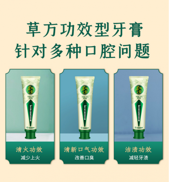 草方牙膏是功效型的中草药牙膏,是六百年老字号“百草堂”旗下的口腔健康护理品牌,积累了深厚的中药口腔养护经验,并一直积极推动中药养护口腔的健康理念。从品牌创立初始,草方牙膏就明确了中草药文化基因,产品以中草药活性成分为核心,结合现代口腔护理、保健技术,将中医典籍的精髓融入现代科技,针对不同程度的多种口腔问题进行分类组方研制,专效解决各类口腔问题,为人民群众的牙齿、牙龈、牙周等口腔健康提供有效的护理。