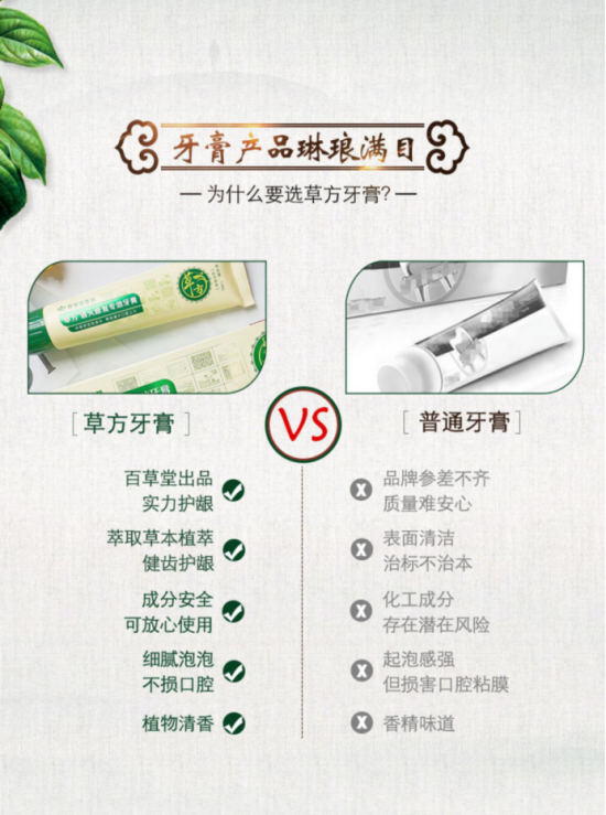 很多消费者反馈,在选购牙膏时,有些功效牙膏的名字一味追求“高大上”,起的“天花乱坠”,如果不做详细深入的研究根本看不出牙膏有何功效,不知该如何选择。草方牙膏想消费者之所想、解消费者之难题,大多产品采取所含主要中药原料+功效的命名思路,让消费者对该款牙膏的功效一目了然,不必“左猜右猜”,方便消费者根据自己的实际需求进行选择。例如“草方金银花清新抗菌牙膏”,一看到牙膏名字就知道这款牙膏的主要成分有金银花,可以清火解热,是一款抗菌功效的中药牙膏。正是因为草方牙膏做好消费者切身关注的每一点细节,真真正正能为消费者解决口腔问题,才能深受消费者的认可和喜爱。