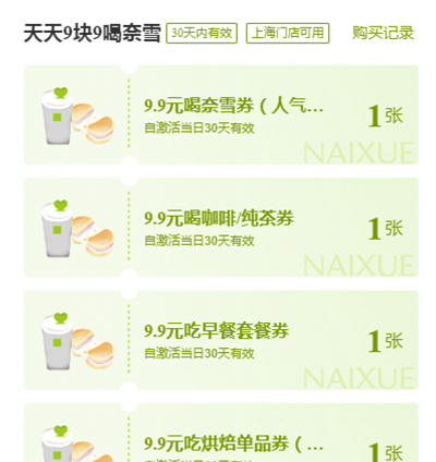 因为购买后,不光每天能享一杯霸气系列产品,还涵盖了早餐、纯茶和咖啡等多种产品,并且价格都是9块9。