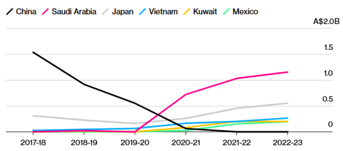 在“双反”措施实行前,中国是澳大利亚大麦最大的出口市场。澳大利亚农业部门数据显示,2017年至2018年度,中国进口澳大利亚大麦的贸易额高达15亿澳元(约合人民币70.6亿元)。这一数据在“双反”后几乎归零,澳大利亚不得不将出口转向沙特阿拉伯、日本和越南等国市场。