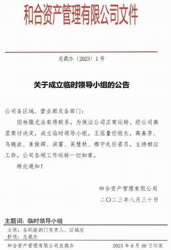 该公告印发于8月30日,公告显示:“因林强无法取得联系”,成立临时领导小组。