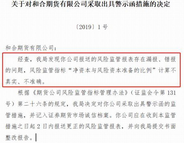 2019年1月,因报送的风险监管报表存在漏报、错报的问题,风险监管指标“净资本与风险资本准备的比例”计算不真实、不准确,和合期货被采取出具警示函措施,并记入证券期货市场诚信档案。