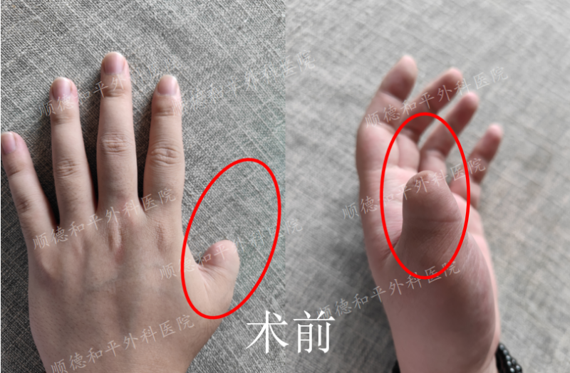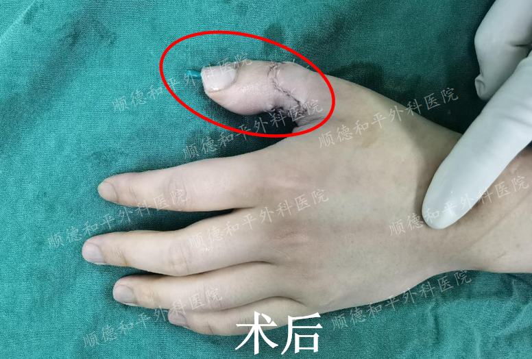 经过多番打听,他从老家四川来到广东顺德,手指再造吴祥主任经过与小冯详细沟通手术设计,以“左拇指三度缺损伤”收治入院,择期手术,术中两组医务人员同时手术,历经接近6小时,游离左足踇趾踇甲瓣+髂骨移植再造左拇指缺损,髂骨取骨植骨,保住了脚趾的同时还能再造手指,看到术后重生的拇指,小冯喜极而泣“我的拇指终于回来了”,10年的阴霾一下拨开。