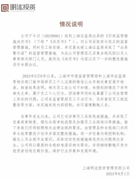 明汯称,2023年5月8号以来,上海市市场监督管理局和上海市证监局等相关部门就市场部员工个人注册的微信公众号相关事宜展开核查。核查结果表明,相关员工在公司不知情、未授权的情况下发布相关文章,属于员工个人行为。但该事件同时也暴露了公司在管理上存在的问题,公司在监督管控员工不当行为、及时督促员工规范整改等方面,未实施有效内部控制,未尽谨慎勤勉义务。