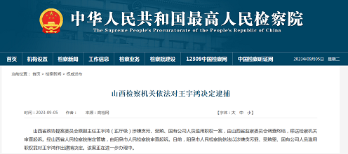 山西省政协提案委员会原副主任王宇鸿(正厅级)涉嫌贪污、受贿、国有公司人员滥用职权一案,由山西省监察委员会调查终结,移送检察机关审查起诉。经山西省人民检察院指定管辖,由阳泉市人民检察院审查起诉。日前,阳泉市人民检察院依法以涉嫌贪污罪、受贿罪、国有公司人员滥用职权罪对王宇鸿作出逮捕决定。该案正在进一步办理中。