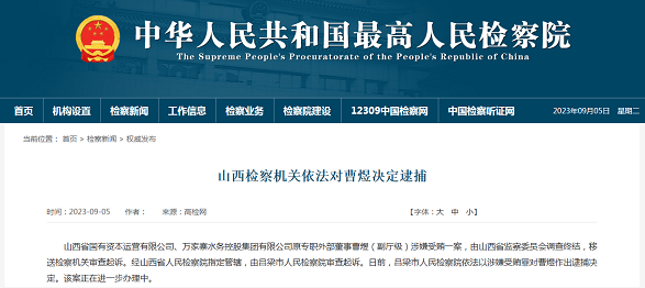 山西省国有资本运营有限公司、万家寨水务控股集团有限公司原专职外部董事曹煜(副厅级)涉嫌受贿一案,由山西省监察委员会调查终结,移送检察机关审查起诉。经山西省人民检察院指定管辖,由吕梁市人民检察院审查起诉。日前,吕梁市人民检察院依法以涉嫌受贿罪对曹煜作出逮捕决定。该案正在进一步办理中。