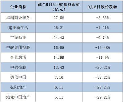 且这9家企业截至9月5日的总市值均在30亿港元以下,其中港龙中国地产、弘阳地产、德信中国总市值均低于10亿港元。