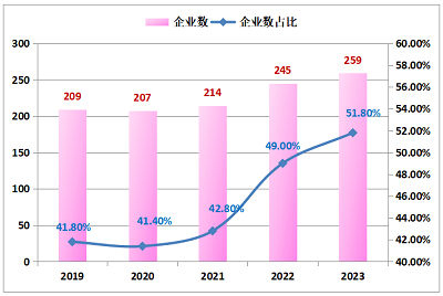 2023年500强企业中,中国企业数达259家,比上年的245家增加14家,占比超过五成达51.80%,比上年的49%增加2.80个百分点。