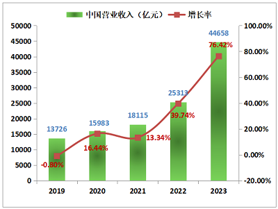 营业收入规模上,2023年500强企业中,中国企业总营业收入达4.47万亿元,比上年的2.53万亿元增加1.94万亿元,营业收入增长76.42%,比上年的39.74%大幅增加36.68个百分点。
