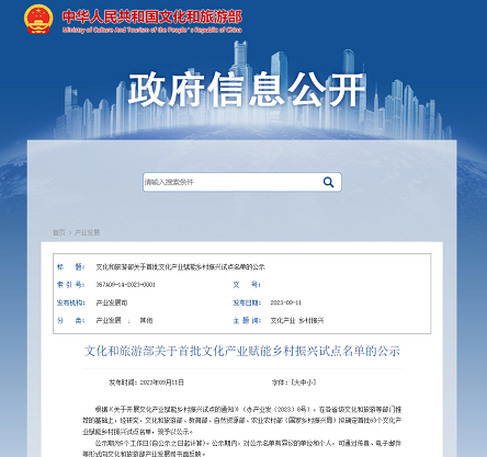 9月11日,文化和旅游部发布关于首批文化产业赋能乡村振兴试点名单的公示,拟确定首批63个文化产业赋能乡村振兴试点名单。其中,山西省晋城市泽州县入选。