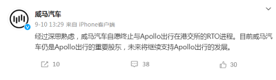 值得注意的是,9月10日,威马汽车刚刚在官方微博上表示:经过深思熟虑,威马汽车自愿终止与Apollo出行在港交所的RTO进程。目前威马汽车仍是Apollo出行的重要股东,未来将继续支持Apollo出行的发展。