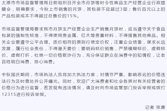 核心提示:月饼包装不应超过3层!太原市召开规范月饼生产提醒会