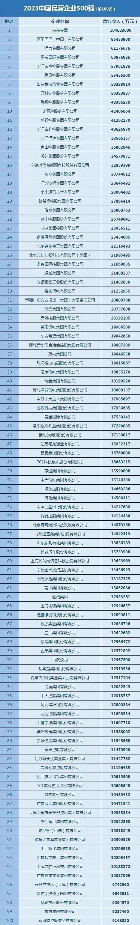 全国工商联9月12日发布2023中国民营企业500强榜单和《2023中国民营企业500强调研分析报告》。京东集团、阿里巴巴(中国)有限公司、恒力集团有限公司位居榜单前三位。