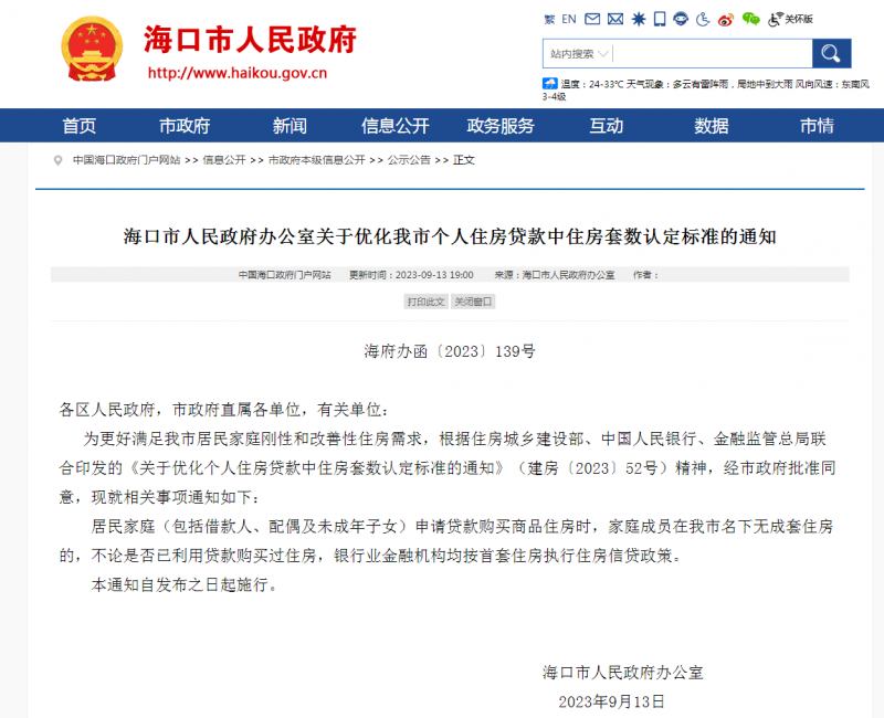 9月13日,海口市人民政府办公室发布《关于优化我市个人住房贷款中住房套数认定标准的通知》(以下简称《通知》),明确从发布之日起,海口执行“认房不认贷”政策。