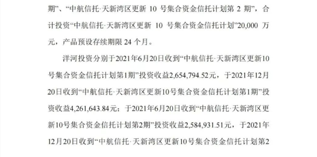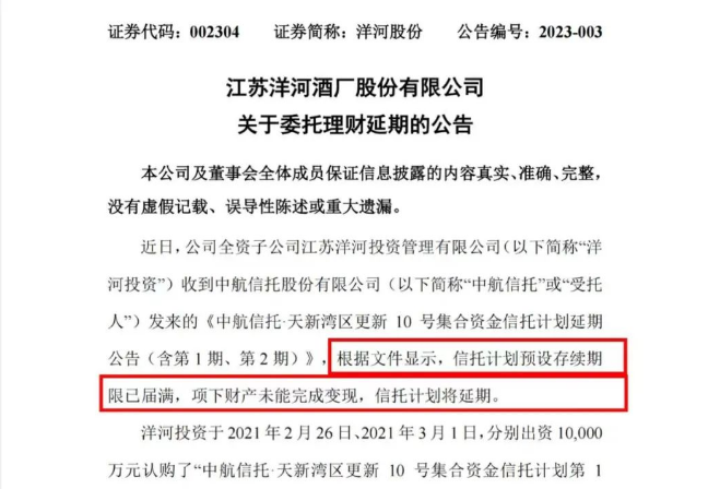 早在今年3月,洋河股份就曾公告称,公司共收到“中航信托·天新湾区更新10号集合资金信托计划”投资收益0.14亿元。截至公告日,信托产品本金2亿元及在2021年12月20日之后的预期收益未收回,信托计划将延期。