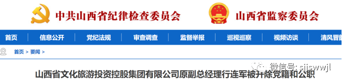 今日,山西省纪委监委发布公告,山西省文化旅游投资控股集团有限公司原副总经理行连军被开除党籍和公职。