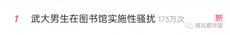 随后,词条“武大男生在图书馆实施性骚扰”话题词条冲上微博热搜榜第一。
