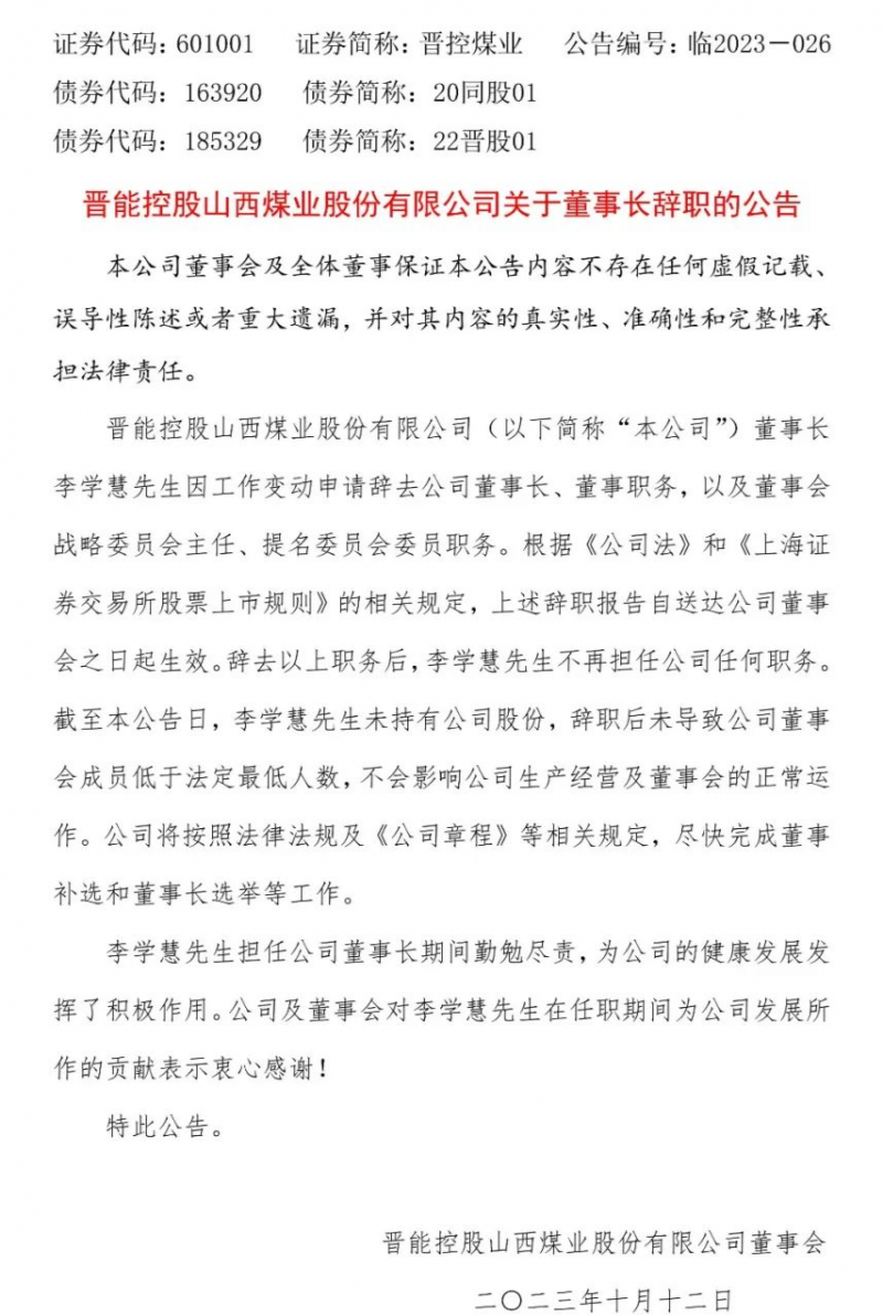 10月11日,晋控煤业公告称,公司董事长李学慧先生因工作变动申请辞去公司董事长、董事职务,以及董事会战略委员会主任、提名委员会委员职务。