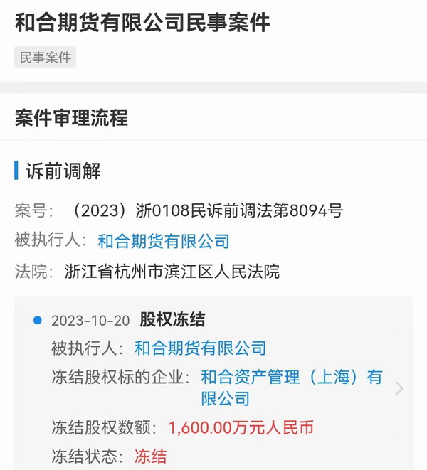 10月20日,浙江省杭州市滨江区人民法院发布文书(2023浙0108民诉前调法第8094号), 冻结呵呵期货有限责任公司旗下和合资产管理(上海)有限公司1600万股权。