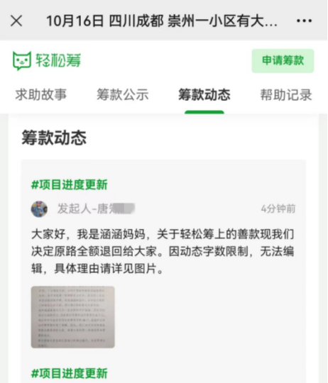 10月25日晚7点,轻松筹官方微博发布退款说明,称成都被狗咬伤女童转出ICU,情况比较稳定,经与发起人沟通,将对未使用的所有善款全额原路退回。善款将在1至7个工作日内原路退回至捐款者支付账户。