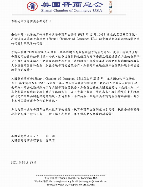 金秋十月,大洋彼岸传来第十三届晋商年会将于2023 年12月16-17 日在北京召开的喜讯。我们谨代表美囯晋商总会 (Shanxi Chamber of Commerce USA) 向中国晋商俱乐部致以最热烈的祝贺和最诚挚的祝愿!!