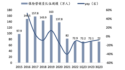 人力队伍建设是三季度行业备受关注的热点,过去一段时间,寿险销售队伍清虚提质,导致销售人力队伍规模持续下降。