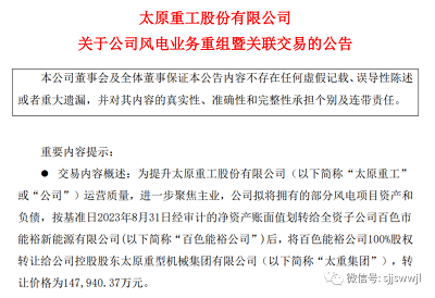 11月13日晚,太重集团旗下A股上市公司太原重工发布公告称,公司拟将拥有的部分风电项目资产148484.32万元和对外负债355.61万元,按基准日2023年8月31日经审计的净资产账面值划转给全资子公司百色市能裕新能源有限公司(以下简称“百色能裕”)后,将百色能裕100%股权转让给公司控股股东太原重型机械集团有限公司(以下简称“太重集团”),转让价格为147940.37万元。