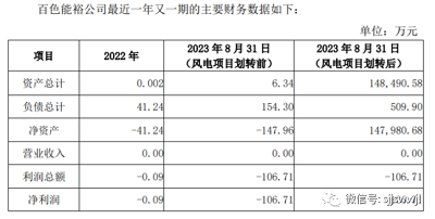 截至2023年8月31诶评估基准日,风电项目划转后的百色能裕总资产账面价值为148490.58万元,评估价值为148450.27万元,减值额为40.31万元,减值率0.03%。总负债账面价值为509.90万元,评估价值为509.90万元,无增减值变化。股东全部权益账面价值为147980.68万元,股东全部权益评估价值为147940.37万元,减值额40.31万元。