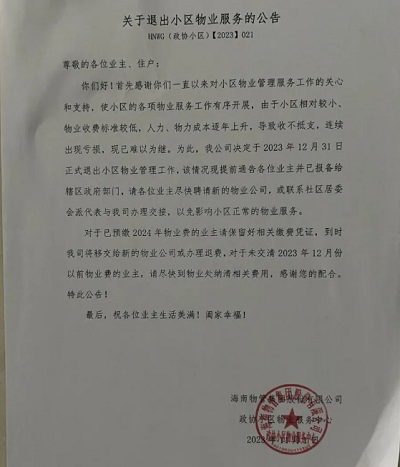 最近,海南物管集团股份有限公司(以下简称“海南物管集团”)政协小区物业服务中心在小区张贴公告称,由于连年亏损,物业服务至今年12月份底退出小区物业管理工作。并称“相关情况已报备辖区政府部门”。