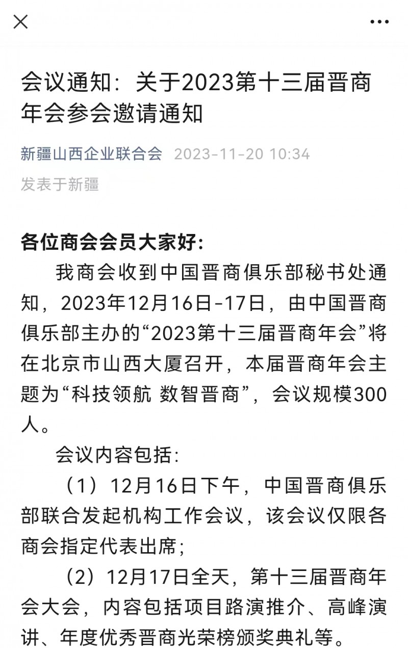 核心提示:新疆山西商会向会员发出2023第十三届晋商年会参会邀请通知。